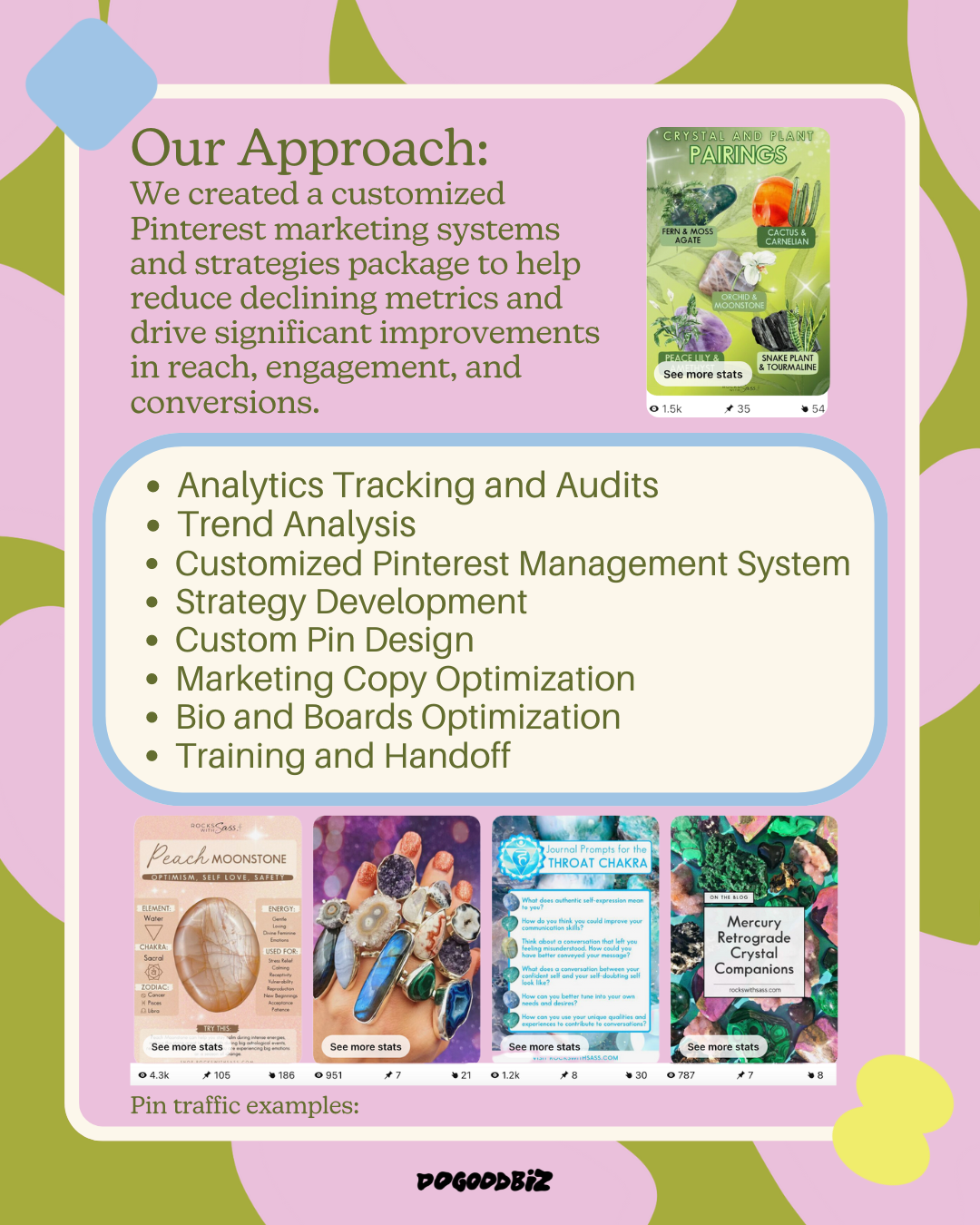 To address these challenges, we developed a customized Pinterest marketing systems and strategies package designed to reverse the decline and drive meaningful improvements. Here’s a breakdown of our approach: