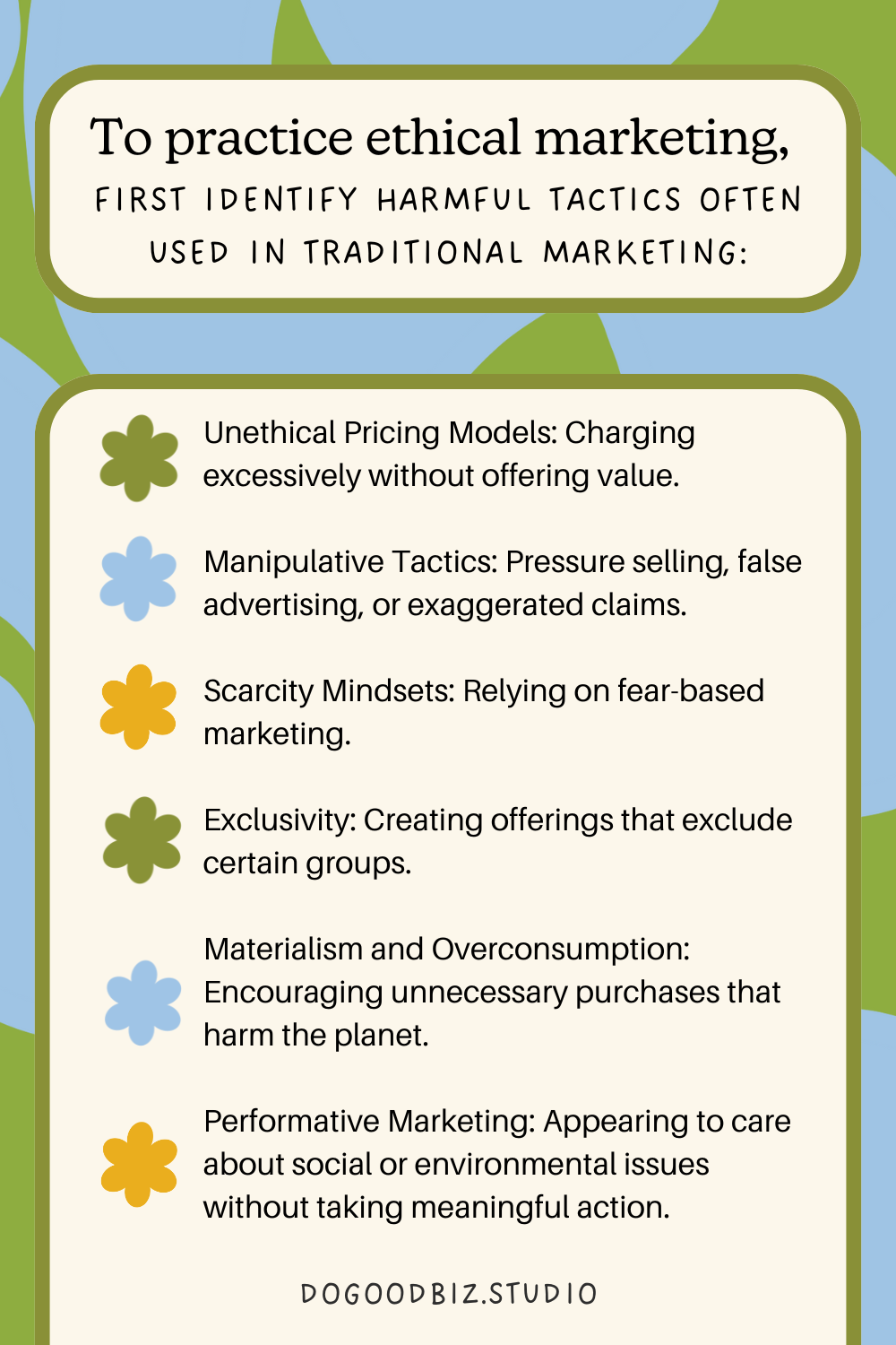 To practice ethical marketing, you must first identify harmful tactics often used in traditional marketing. Reflect on whether your current strategies unintentionally cause harm:
