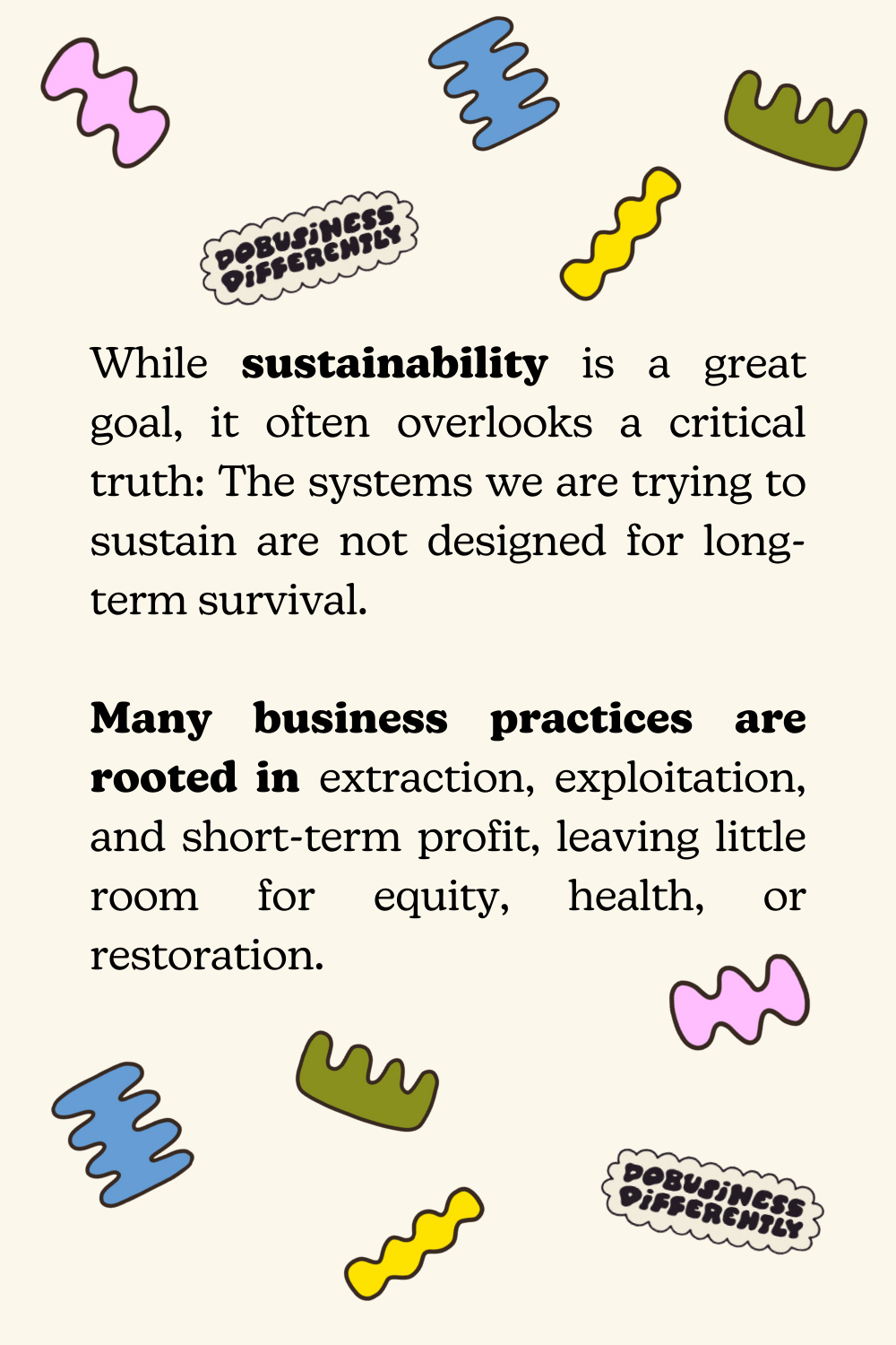 While sustainability is a great goal, it often overlooks a critical truth: the systems we are trying to sustain are not designed for long-term survival. Many business practices are rooted in extraction, exploitation, and short-term profit, leaving little room for equity, health, or restoration.