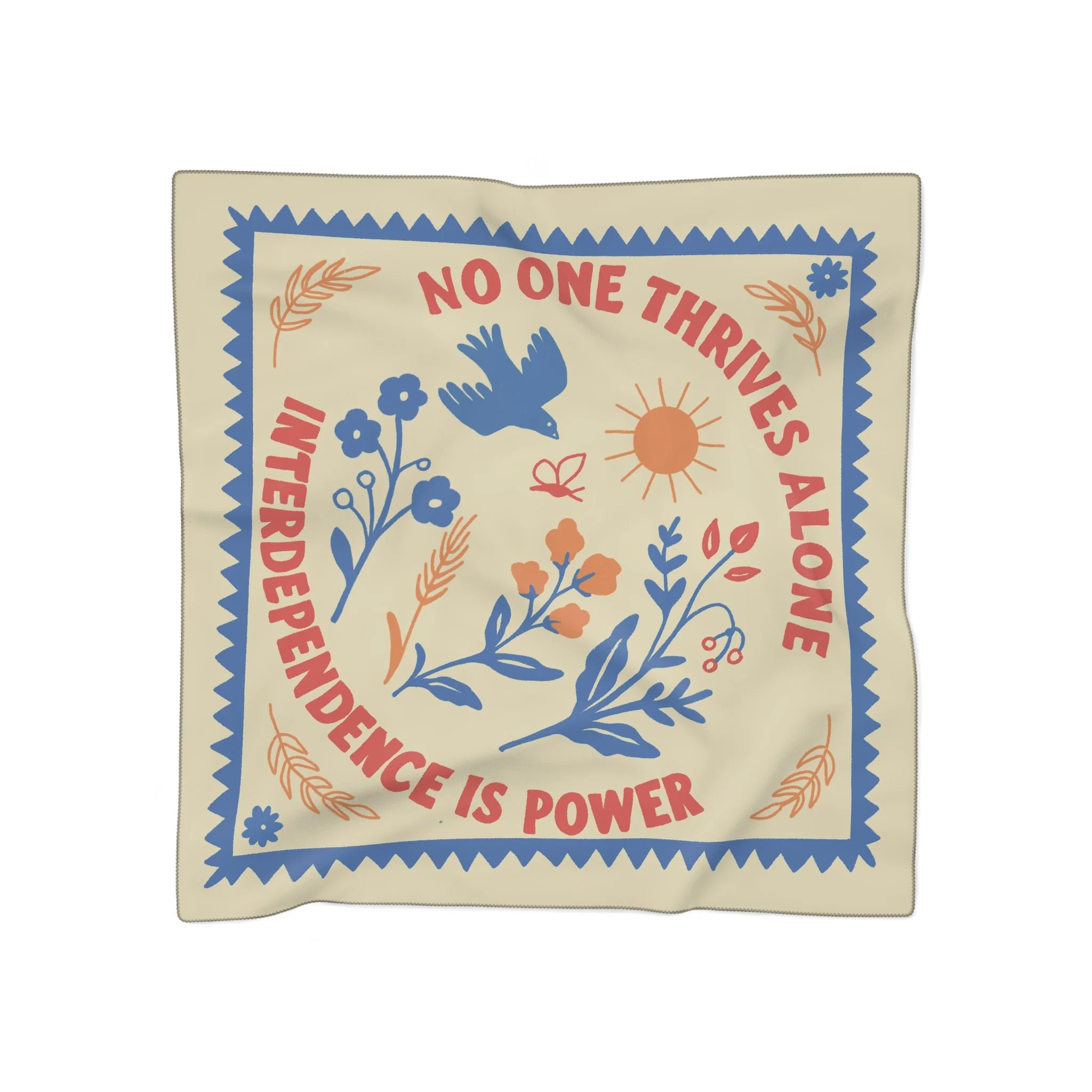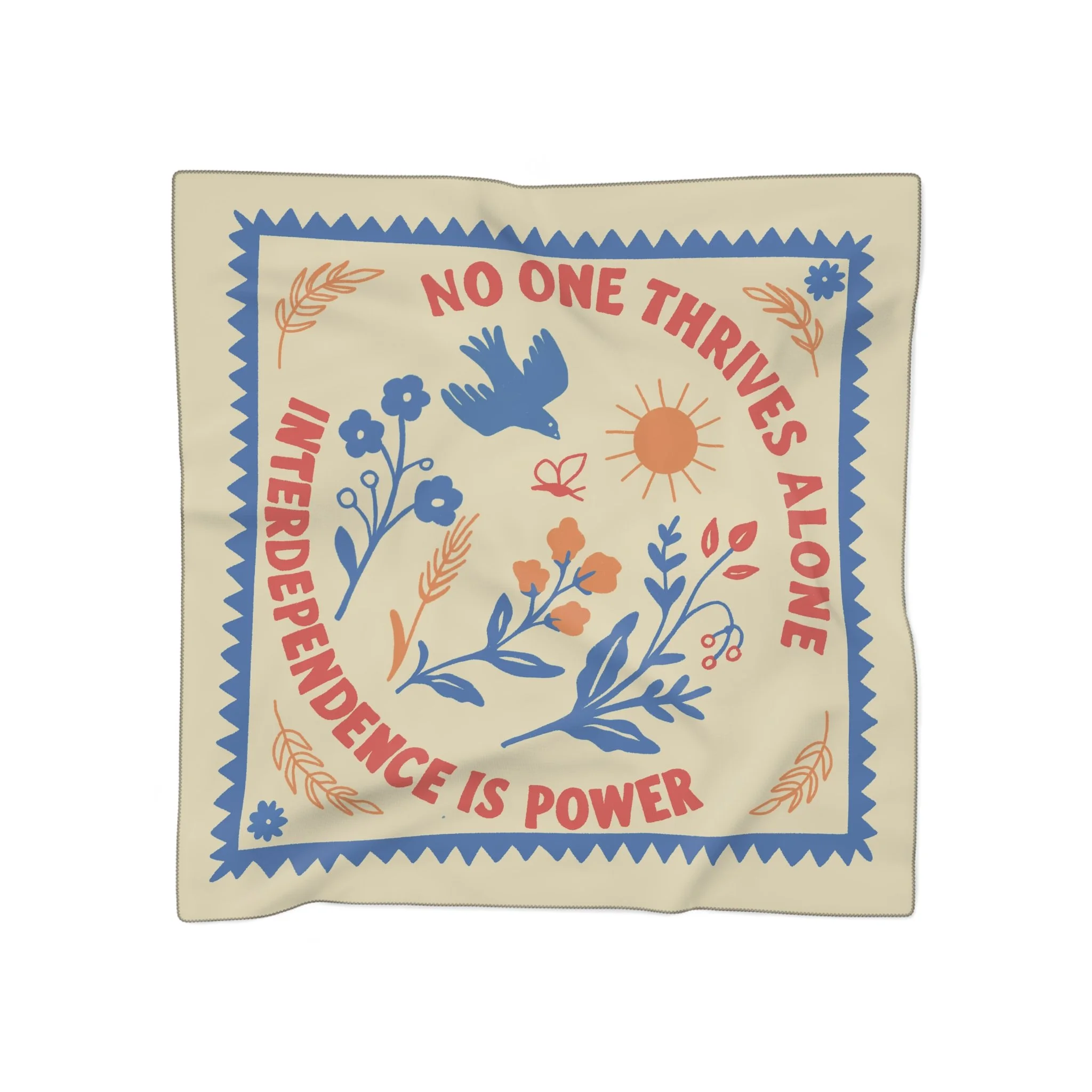 A wearable reminder that we rise together. This bandana-style scarf features hand-drawn, folksy nature motifs and the message “No one thrives alone — Interdependence is power.” Perfect for creatives, nature lovers, and anyone building a world rooted in care and connection.
